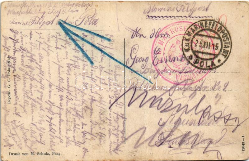 Leírás: 1915 SMS Viribus Unitis az Osztrák-Magyar Haditengerészet Tegetthoff-osztályú csatahajója / K.u.K. Kriegsmarine / WWI Austro-Hungarian Navy Tegetthoff-class battleship. G. C. Pola 1915. (fa) + "K.u.k. Matrosenkommando Wachabteilung"