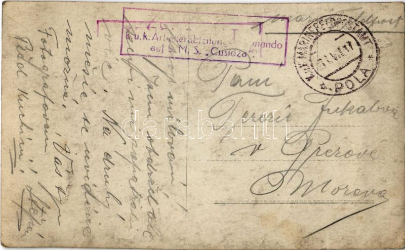 Leírás: 1917 K.u.K. Kriegsmarine Matrosen / Osztrák-magyar haditengerészet matrózai munka közben / WWI Austro-Hungarian Navy mariners. photo + "K.u.k. Arbeiterabteilungskommando auf S.M.S. CUSTOZA" Zensuriert (fl)