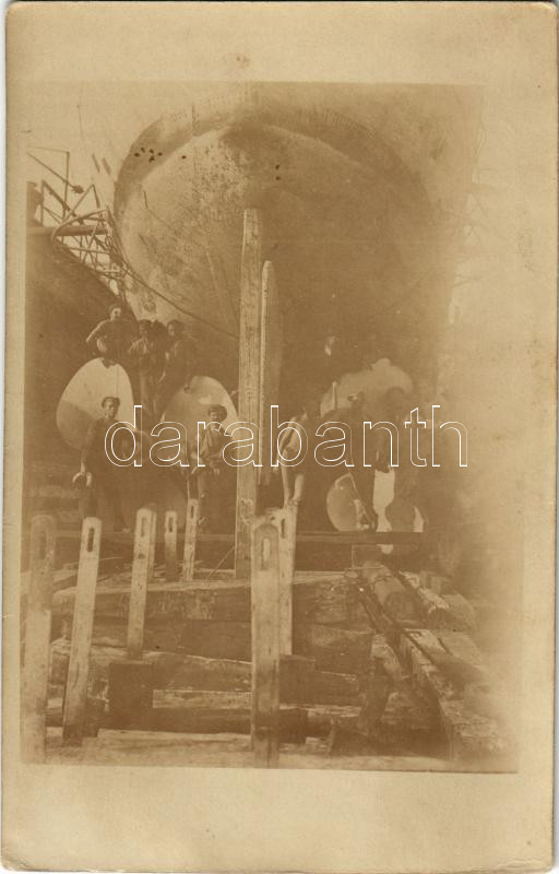 1918 SMS Lika osztrák-magyar Tátra-osztályú romboló a szárazdokkban, matrózok / K.u.K. Kriegsmarine / SMS Lika Austro-Hungarian Navy Tatra-class destroyer in the dry dock, mariners working on the screws and boiler overhaul. photo (fl)