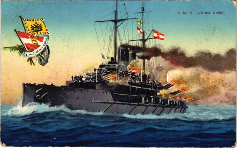 1918 SMS Viribus Unitis az Osztrák-Magyar Haditengerészet Tegetthoff-osztályú csatahajója / K.u.K. Kriegsmarine / WWI Austro-Hungarian Navy Tegetthoff-class battleship, naval flag with anchor. Druck von M. Schulz. G. C. Pola 1915. (ázott sarok / wet corner)