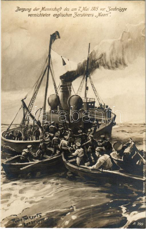 Leírás: Bergung der Mannschaft des am 7. Mai 1915 vor Zeebrügge vernichteten englischen Zerstörers "Maori" / WWI German Navy (Kaiserliche Marine) art postcard