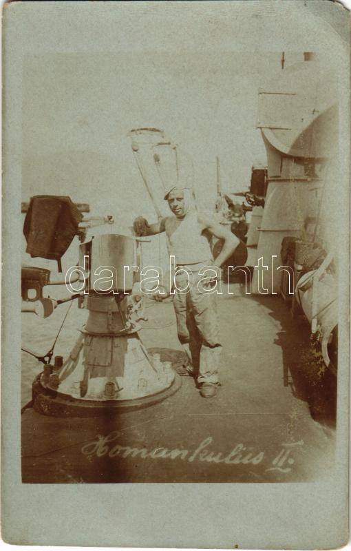 Homunkulus II. SMS Lika osztrák-magyar Tátra-osztályú romboló matróza fedélzeti fegyver mellett / K.u.K. Kriegsmarine Matrose / SMS Lika Austro-Hungarian Navy Tatra-class destroyer's mariner next to a gun mount. photo (EK)