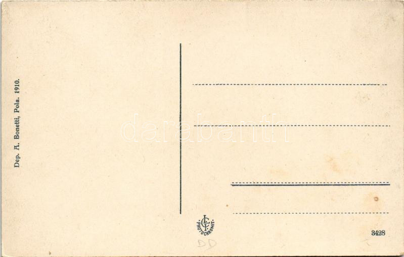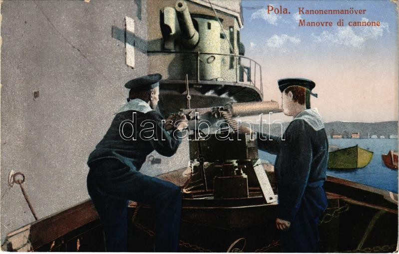 Leírás: K.u.K. Kriegsmarine, Kanonenmanöver / Manovre di cannone / Austro-Hungarian Navy, cannon maneuvers, mariners. Dep. A. Bonetti Pola 1910.