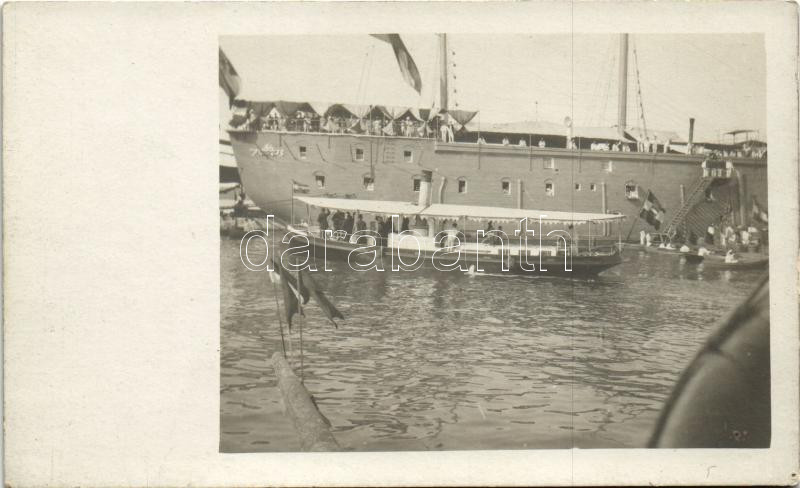 K.u.K. Kriegsmarine SMS Erzherzog Ferdinand Max / Cs. és kir. haditengerészet SMS Erzherzog Ferdinand Max páncélos csatahajója, látogatók érkeznek egy gőzbárkán / Austro-Hungarian Navy ironclad battleship, visitors arriving. photo