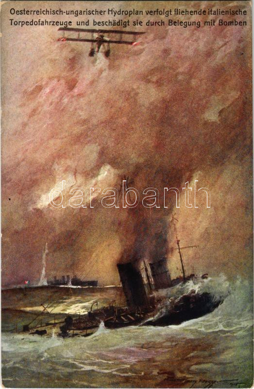 Österreichisch-ungarischer Hydroplan verfolgt fliehende Italienische Torpedofahrzeuge und beschädigt sie durch Belegung mit Bomben. K.u.K. Kriegsmarine Seeflugzeug. Offizielle Karte für Rotes Kreuz. Kriegsfürsorgeamt Kriegshilfsbüro Nr. 158. / WWI Austro-Hungarian Navy seaplane pursue Italian torpedo destroyers and damages them by bombs, naval aircraft s: Harry Heusser (EK)