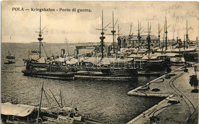 Pola, K.u.k. Kriegsmarine Kriegshafen: SMS Custoza, Zenta, Aspern, Szi... https://www.darabanth.com/hu/472-Gyorsarveres/472.0/Kepeslapok/Hadihajo~1500037/Pola-Kuk-Kriegsmarine-Kriegshafen-SMS-Custoza-Zenta-Aspern-Szigetvar-Lacroma-G-Fano-Pola~II2978136