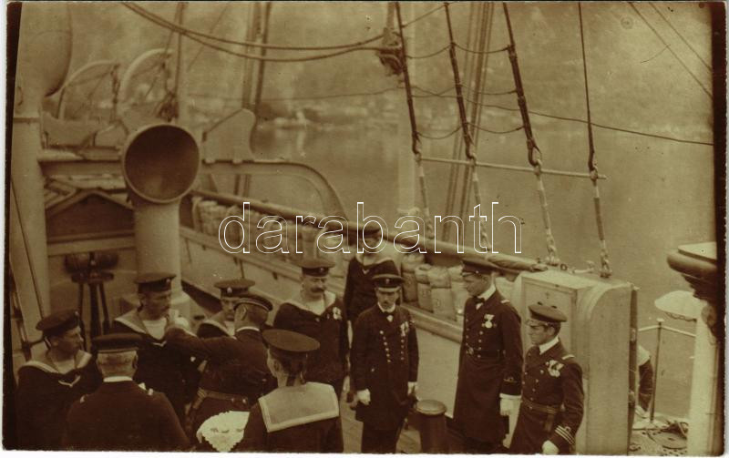 Leírás: SMS Panther Osztrák-Magyar Haditengerészet Panther-osztályú torpedócirkáló fedélzete, tisztek és matrózok vitézségi érmek kiosztása közben / K.u.K. Kriegsmarine / On deck of SMS Panther Austro-Hungarian Navy torpedo cruiser, mariners and Naval officers distributing medals. photo