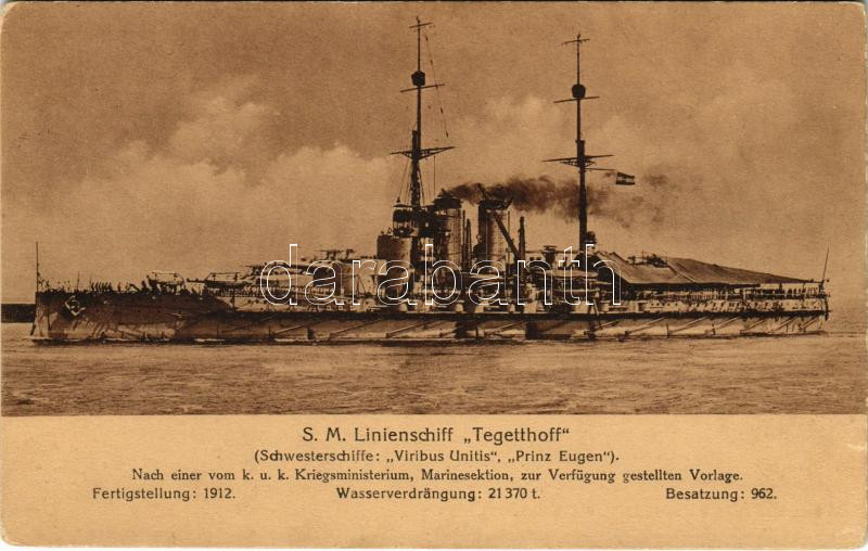 Leírás: SMS TEGETTHOFF az Osztrák-Magyar Haditengerészet Tegetthoff-osztályú csatahajó / K.u.K. Kriegsmarine / WWI Austro-Hungarian Navy Tegetthoff-class battleship. Marine-Erinnerungs-Karte Ernst Wiest Nr. 72A