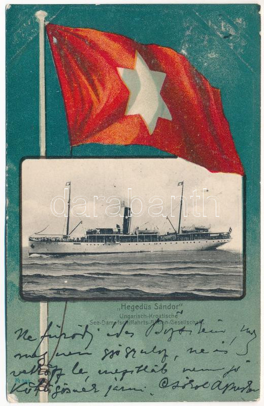 1908 Hegedűs Sándor egycsavaros tengeri személy és áruszállító gőzhajó. Szecessziós zászlós litho / Ungarische-Kroatische See-Dampfschiffahrts Aktien Gesellschaft / Hungarian sea steamship. Art Nouveau flag litho (ázott / wet damage)