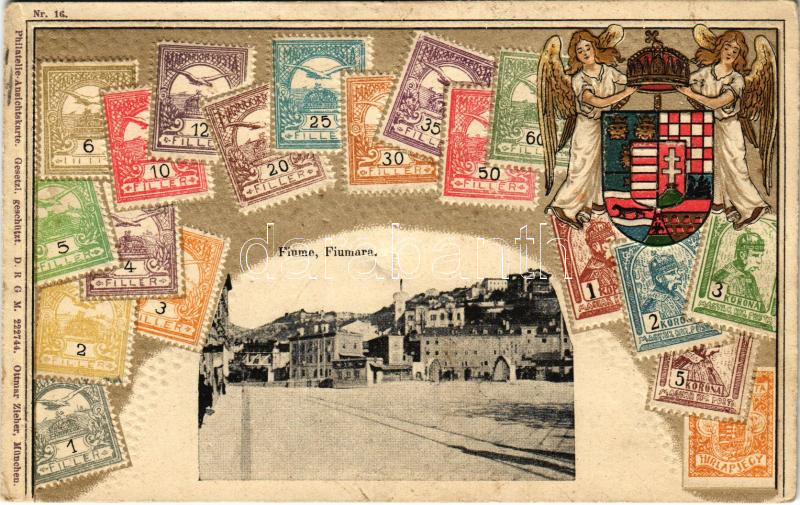 1905 Fiume, Rijeka; látkép. A Magyar kir. Posta bélyegei és magyar címer. Dombornyomott / Fiumara. Set of Hungarian stamps with coat of arms. Ottmar Zieher Philatelie-Ansichtskarte Nr. 16. Emb. litho (lyukak / pinholes)