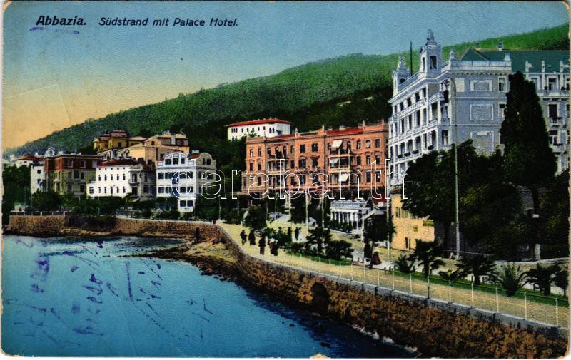 Abbazia, Opatija; Südstrand mit Palace Hotel https://www.darabanth.com/hu/472-Gyorsarveres/472.0/Kepeslapok/Horvatorszag~1500010/Abbazia-Opatija-Sudstrand-mit-Palace-Hotel~II3177635