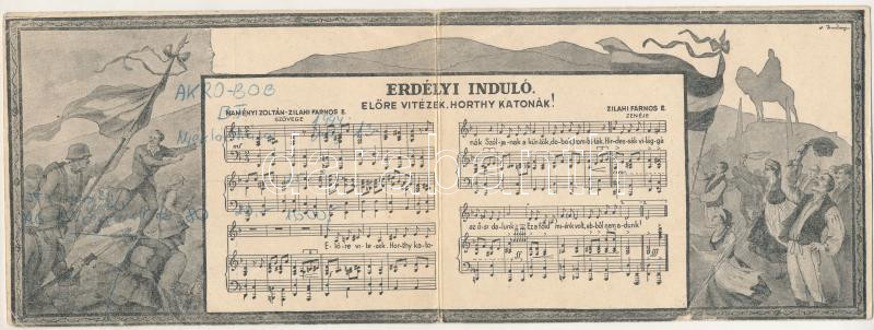 Erdélyi induló. Előre vitézek, Horthy katonák! Zilahi Farnos E. zenéje, Naményi Zoltán-Zilahi Farnos E. szövege. Kiadja a Magyar Nemzeti Szövetség. 2-részes kinyitható irredenta kottás képeslap / WWII Hungarian Army's Transylvanian military anthem, irredenta propaganda, 2-tiled folding card with sheet music s: Buday (fa)