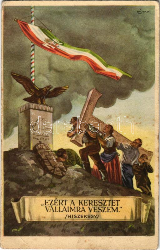 Ezért a keresztet vállaimra veszem. Hiszekegy. Kiadja az Ereklyés Országzászló Nagybizottsága / Hungarian irredenta propaganda, Hungarian flag, Treaty of Trianon s: Lamoss (EB)