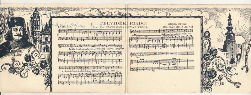 Felvidéki riadó! Rákóczi Ferenc induló kottával. 2-részes irredenta kihajtható képeslap. Magyar Nemzeti Szövetség kiadása / Upper Hungarian irredenta marching song with music sheet, 2-tiled folding card s: Zsolt (EB)