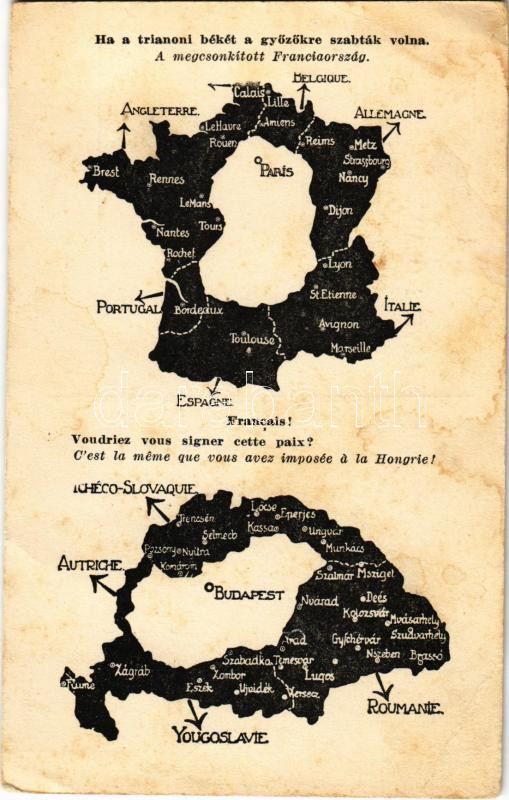 Ha a trianoni békét a győzőkre szabták volna. A megcsonkított Franciaország. Kiadja a Magyar Nemzeti Szövetség / Trianon peace treaty, map of a lesser France, Hungarian irredenta propaganda (EB)