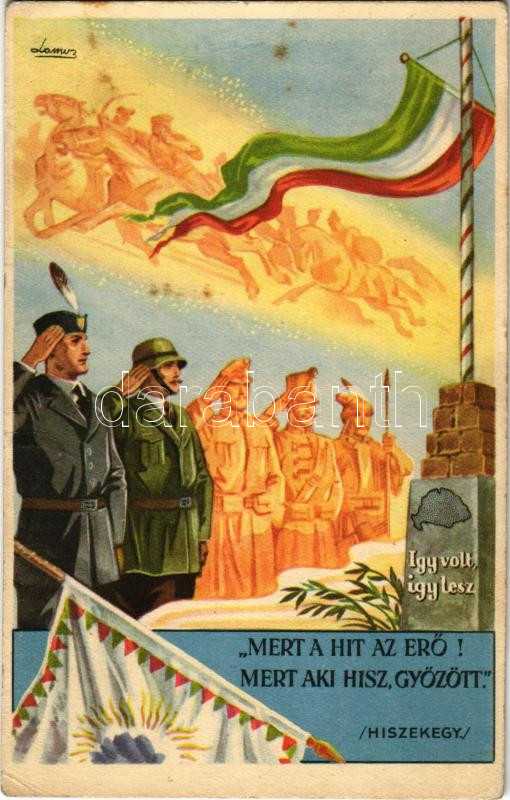Így volt, így lesz! "Mert a hit az erő! Mert aki hisz, győzött" (Hiszekegy). Kiadja az Ereklyés Országzászló Nagybizottsága / Hungarian irredenta propaganda, Hungarian flag, Trianon s: Lamoss (EK)