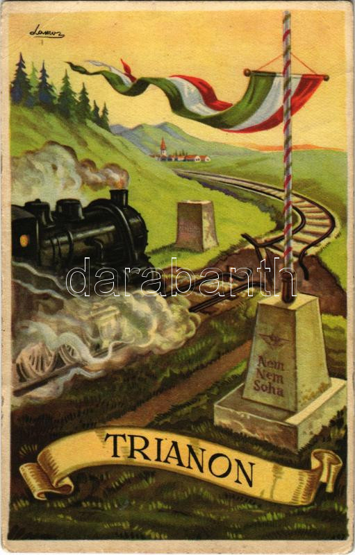 Leírás: Trianon, gőzmozdony. Kiadja az Ereklyés Országzászló Nagybizottsága / Hungarian irredenta propaganda, Hungarian flag, locomotive s: Lamoss (EB)