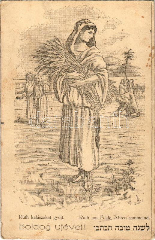 Ruth kalászokat gyűjt. Boldog Újévet! Héber nyelvű zsidó újévi üdvözlőlap. Judaika / Ruth am Felde Ähren sammelnd / Jewish New Year greeting with Hebrew text, Judaica (non PC) (fa)