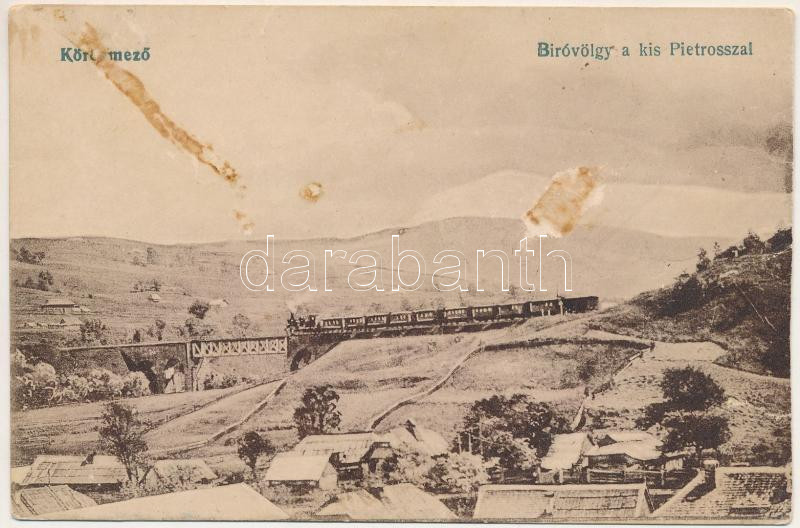 Kőrösmező, Körösmező, Yasinia, Yasinya, Jaszinya, Jassinja, Jasina (Máramaros); Biróvölgy a kis Pietrosszal, vasúti híd, gőzmozdony, vonat. Vasúti levelezőlapárusítás / railway bridge, locomotive, train (ragasztónyom / glue marks)