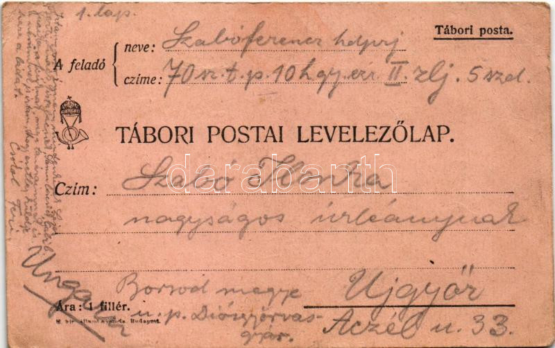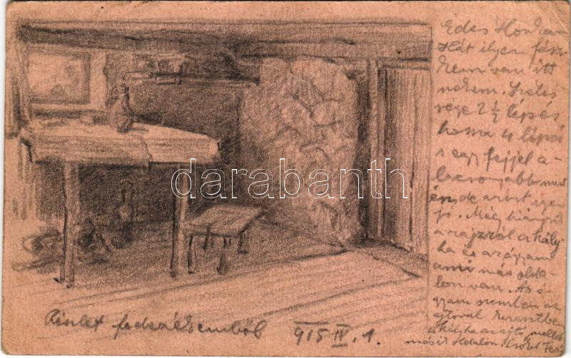1915 Részlet fedezékemből. Szabó Ferenc hdpzj. saját kezű rajza tábori postai levelezőlapon. 70. sz. t. p. 10. h. gy. ezr. II. zlj. 5. szd./ WWI K.u.k. Austro-Hungarian military hand-drawn field post (EB)
