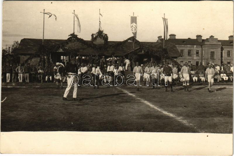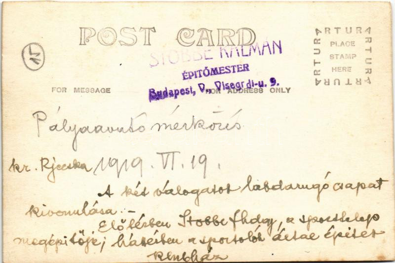 1919 Krasznaja Recska, Rjecska, Krasnaia- Rjetschka (Habarovszk, Khabarovsk); Az ekkor már amerikai fennhatóság alatt hadifogoly álló tábor új focipályájának megnyitója, pályaavató labdarúgó mérkőzés. Fotólap 14x9 cm Hátoldalán Stobbe Kálmán (1883-1936) építőmester, labdarúgó, a magyar válogatott edzője pecsétjével / Opening football match of the new foootball field in the Japanese-Russian POW (prisoner of war) camp. photo