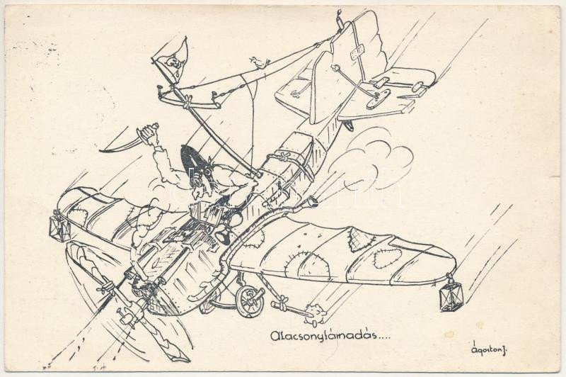 Leírás: 1940 Alacsonytámadás... Magyar humoros katonai lap, pilóta repülőgépen / Hungarian military art postcard, humour, pilot in aircraft s: Ágoston (EK)