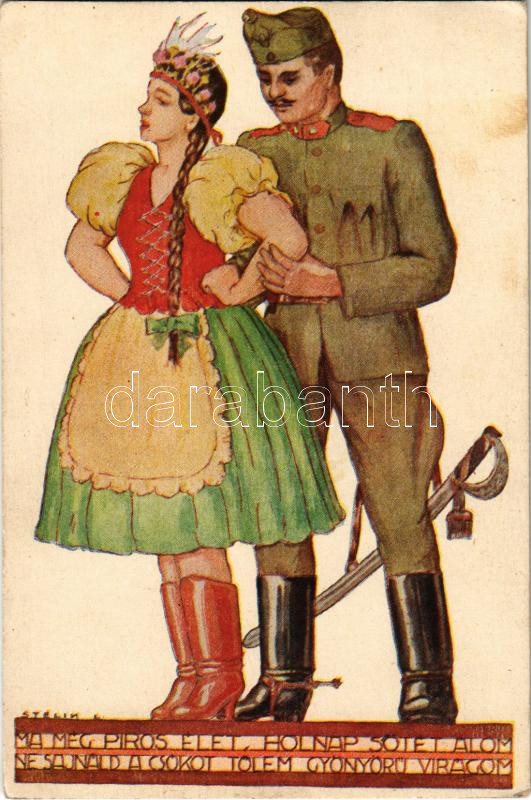 1942 Ma még piros élet, holnap sötét álom, ne sajnáld a csókot tőlem gyönyörű virágom. Magyar katonai romantikus üdvözlet / WWII Hungarian military greeting s: Stélik L. (EK)