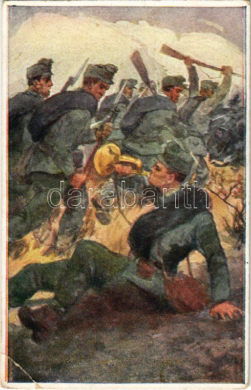 Hornist Kovács. Aus dem goldenen Buche der Armee Serie III. Offizielle Karte für Rotes Kreuz, Kriegsfürsorgeamt Kriegshilfsbüro Nr. 355. / WWI Austro-Hungarian K.u.K. military art postcard, soldier with horn (EB)
