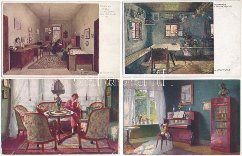 Leírás: 20 db RÉGI képeslap vegyes minőségben: lakás belsők művészlapokon