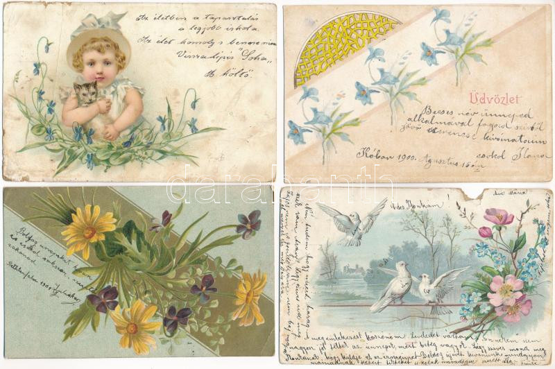 Leírás: 40 db RÉGI hosszú címzéses virágos litho üdvözlő képeslap vegyes minőségben / 40 pre-1905 flower litho greeting postcards in mixed quality
