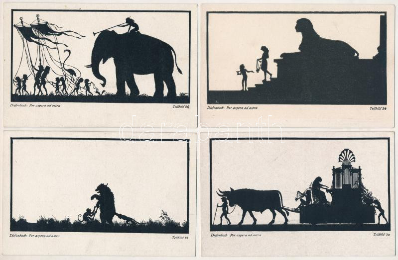 Leírás: Diefenbach: Per aspera ad astra - 34 db régi postatiszta sziluettes művész képeslap / 34 pre-1945 unused silhouette art postcards