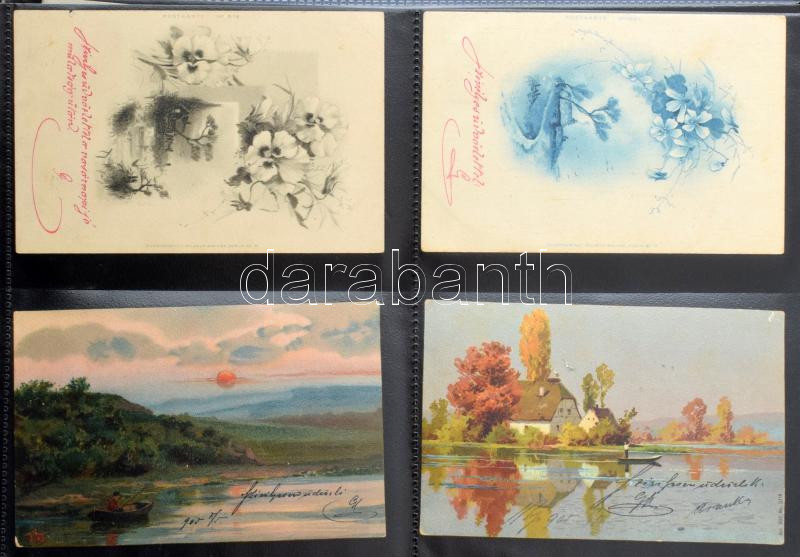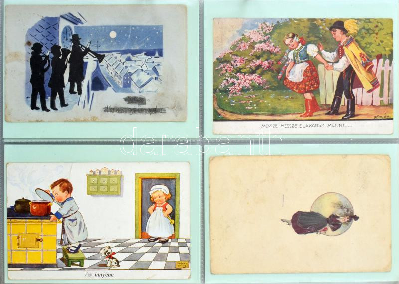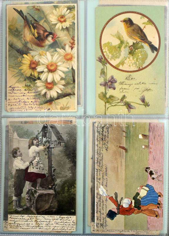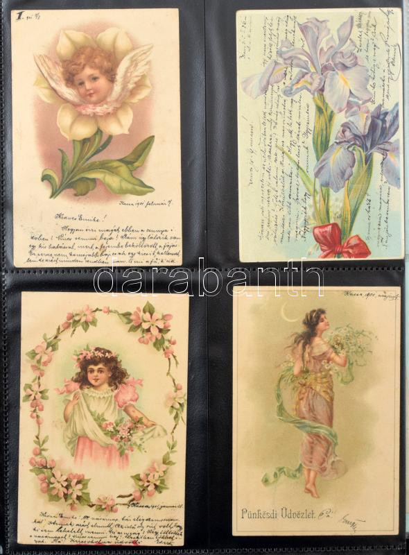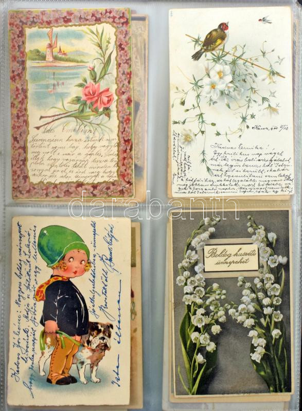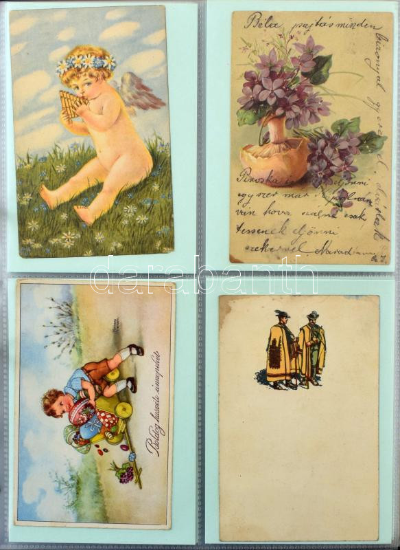 Motívum képeslap gyűjtemény maradvány, több mint 250 db régi képeslap iratrendezőben sok jó motívummal, üdvözlőkkel, hölgyek gyerekek, kézzel festett, stb. érdemes megnézni!!