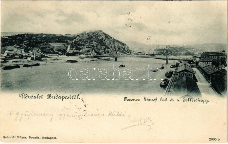 Leírás: 1899 (Vorläufer) Budapest, Ferenc József híd és a Gellérthegy (még nincs Gellért tér, Szent Gellért fürdő, Műegyetem). Schmidt Edgar kiadása (fl)