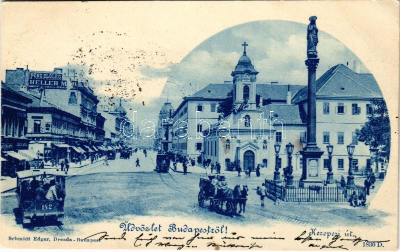 Leírás: 1899 (Vorläufer) Budapest VIII. Kerepesi út (Rákóczi út), Szent Rókus kórház, lóvasút, Heller Mór üzlete (EK)