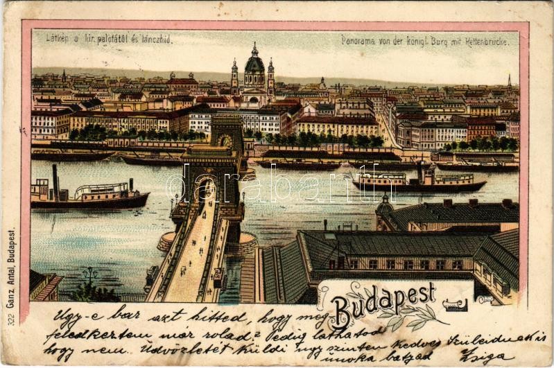 1900 Budapest I. Látkép a Királyi palotától és Lánchíd. Ganz Antal 322... https://www.darabanth.com/hu/472-Gyorsarveres/472.0/Kepeslapok/Magyarorszag~1500006/1900-Budapest-I-Latkep-a-Kiralyi-palotatol-es-Lanchid-Ganz-Antal-322-litho-EB~II2580983