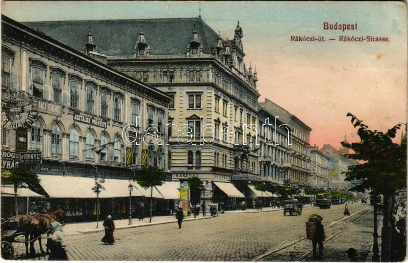 1914 Budapest VII. Rákóczi út, villamos, Nagy Ferenc, Steiner Ernő, N. Ármin üzletei, Domonyi Endre asztalosműhelye, fogorvosi rendelő, Hotel Metropole szálloda és kávéház (fl)