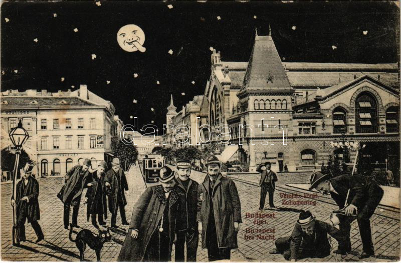 Leírás: Budapest IX. Vámház körút, Vásárcsarnok, Nádor szálloda és kávéház, villamos. Humoros éjjeli montázs részeg férfiakkal (fl)