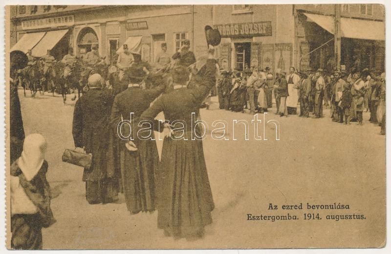 Esztergom, Az ezred bevonulása Esztergomba 1914. augusztus. Vörös Józs... https://www.darabanth.com/hu/472-Gyorsarveres/472.0/Kepeslapok/Magyarorszag~1500006/Esztergom-Az-ezred-bevonulasa-Esztergomba-1914-augusztus-Voros-Jozsef-Popper-es-Leier-uzle~II3198652