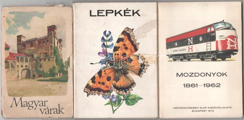 Leírás: 3 db MODERN magyar képeslap sorozat: Magyar várak, Lepkék, Mozdonyok 1861-1962