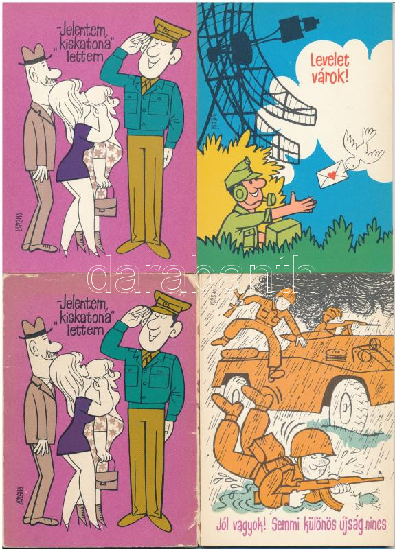 Jelentem kiskatona lettem - 12 db modern katonai humor képeslap sorozat saját tokjában, rajzolta Pusztai Pál / 12 modern Hungarian military humour postcard series in its own case, signed by Pál Pusztai