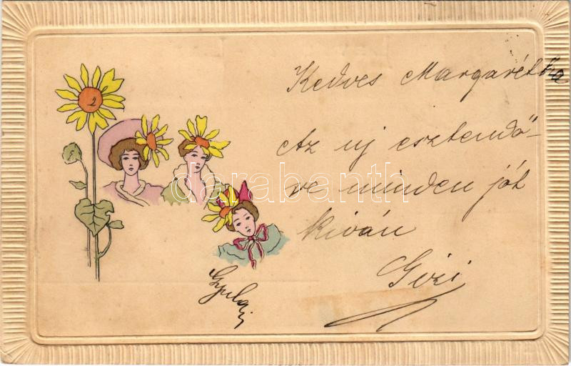 Leírás: 1900 Lady art postcard, sunflowers. B.R.W. (ázott / wet damage)