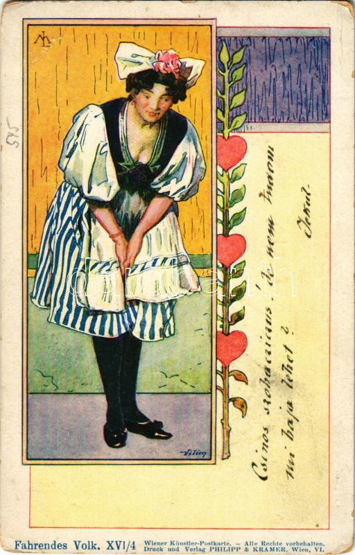 Leírás: Fahrendes Volk XVI/4. Wiener Künstler-Postkarte Druck und Verlag Philipp & Kramer. Art Nouveau s: Maximilien Lenz (kopott sarkak / worn corners)