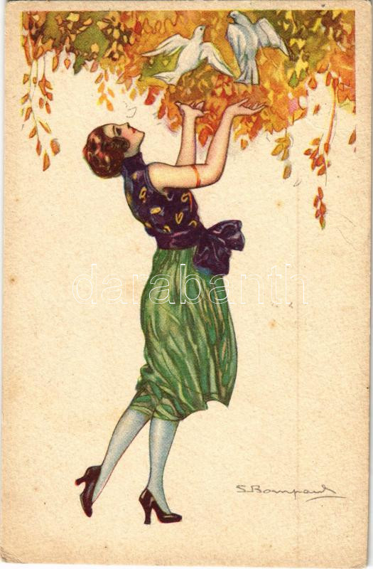 Lady with pigeons. Italian lady art postcard s: S. Bompard https://www.darabanth.com/hu/472-Gyorsarveres/472.0/Kepeslapok/Muveszlapok~1500068/Lady-with-pigeons-Italian-lady-art-postcard-s-S-Bompard~II3195145