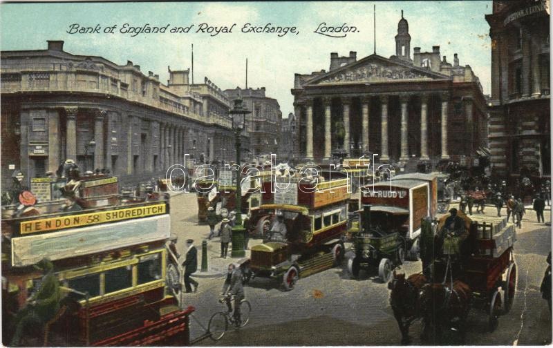 Leírás: London, Bank of England and Royal Exchange, double-decker buses, autobus, automobile, horse-drawn carriages, bicycle (EB)