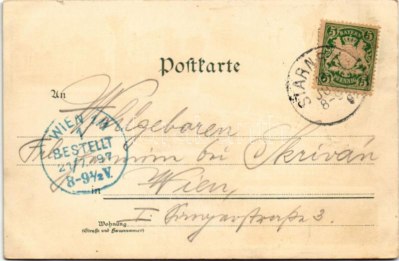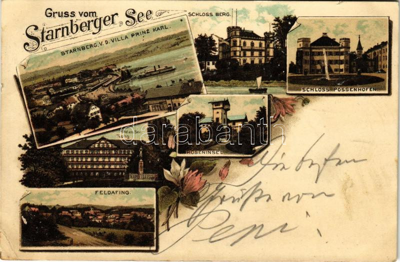 1897 (Vorläufer!) Starnberger See, Starnberg v. d. Villa Prinz Karl, Schloss Berg, Schloss Possenhofen, Roseninsel, Hotel am See Tusing, Feldafing / general view, railway station, castles, villa, hotel. Art Nouveau, Floral, litho (fl)