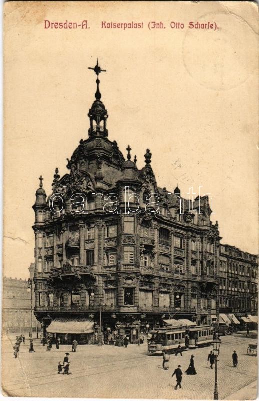 1908 Dresden, Kaiserpalast (Inh. Otto Scharfe) / palace, tram, shops. ... https://www.darabanth.com/hu/472-Gyorsarveres/472.0/Kepeslapok/Nemetorszag~1500089/1908-Dresden-Kaiserpalast-Inh-Otto-Scharfe-palace-tram-shops-Hermann-Poy-EB~II2174042