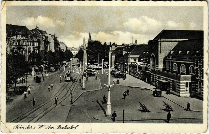 Leírás: 1937 Münster, Am Bahnhof / railway station, tram, automobile, Hotel Continental (fa)