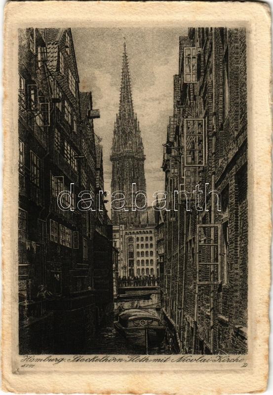 Hamburg, Steckelhörn Fleth mit Nicolai Kirche / church (worn edges) https://www.darabanth.com/hu/472-Gyorsarveres/472.0/Kepeslapok/Nemetorszag~1500089/Hamburg-Steckelhorn-Fleth-mit-Nicolai-Kirche-church-worn-edges~II2014256