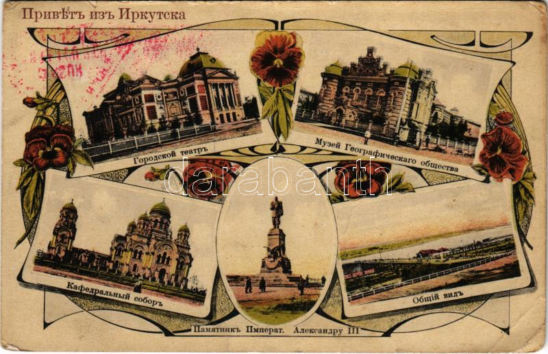Leírás: Irkutsk, Theatre, Museum of the Russian Geographical Society, Cathedral, monument of Alexander III of Russia, general view. Art Nouveau, floral (EB)