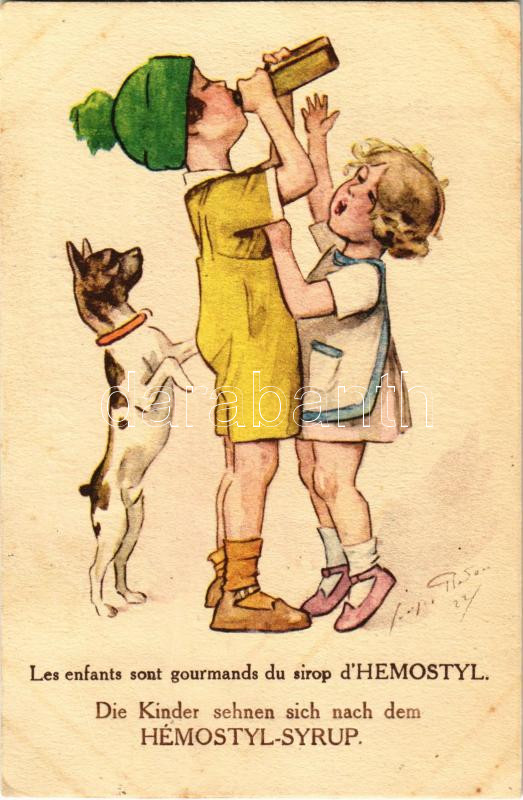 1928 Die Kinder sehnen sich nach dem Hemostyl-Syrup / Hemostyl szirup reklám "Gyerekek vágynak a Hemostyl szirupra" / French medicine advertisement (EK)